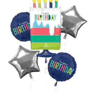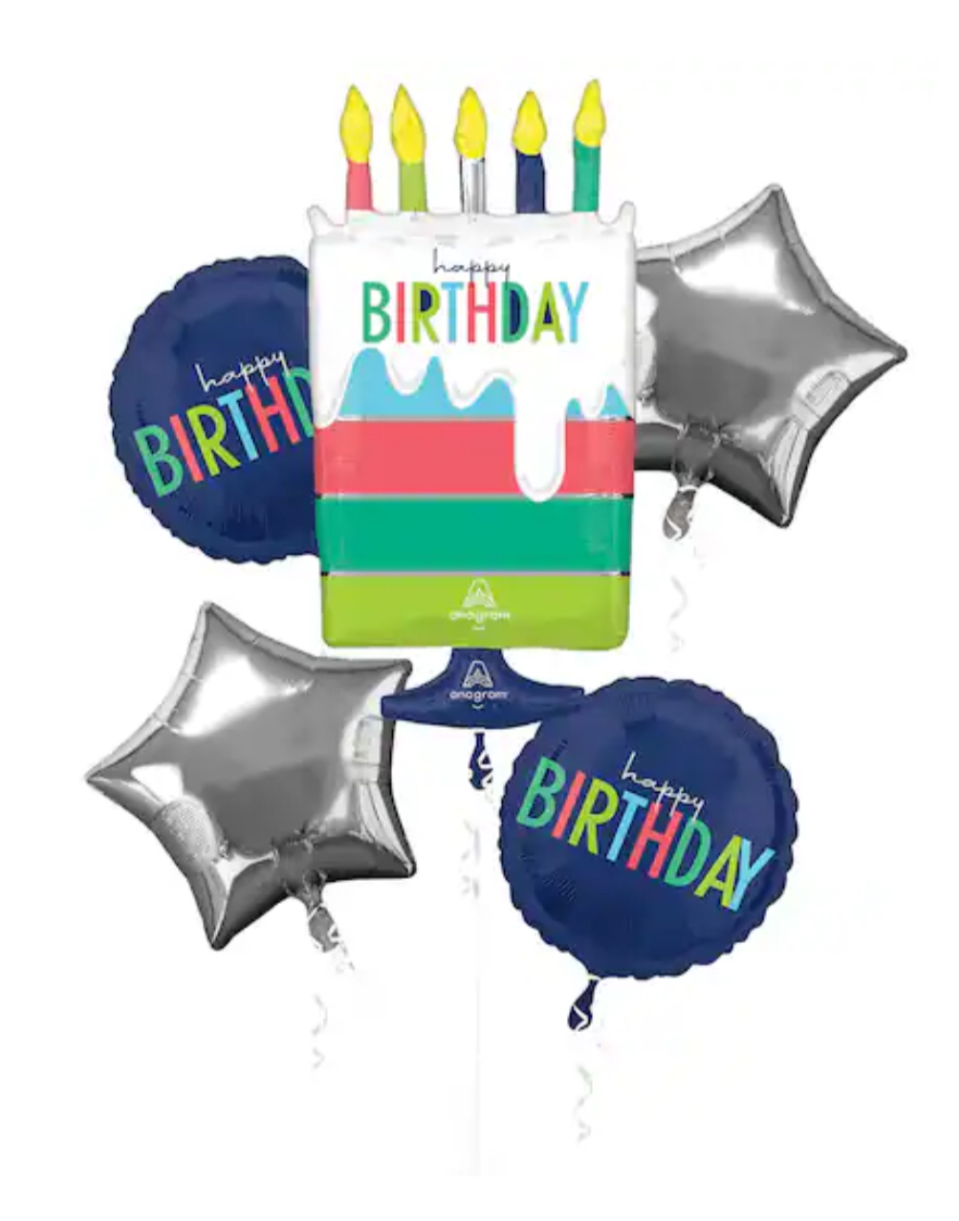 A five-piece foil balloon bouquet in a birthday or congratulations theme